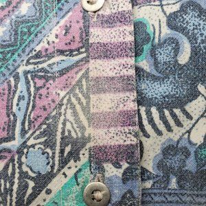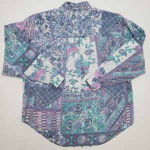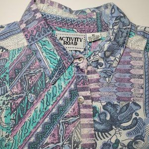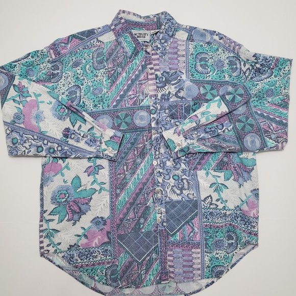 ⚡ Vintage 90's crazy funky mom floral button up shirt. 90's Activity Road quirky fun retro grandma printed button up shirt. Flowers and geometric art shapes. Purple, blue, white, pink. Flaw: loss of dye around a stain between second and third button from the collar (may not be seen if left unbuttoned). Tagged women's medium, fits oversized. ⚡