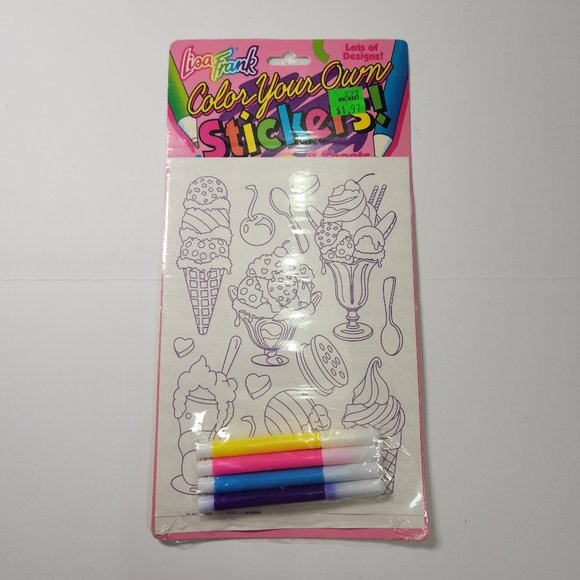 ⚡ Vintage Lisa Frank ice cream sundae color your own sticker pack NWT new old stock. 80's Vintage Lisa Frank sticker pack stationery. Comes with 2 sheets and four markets. Retro ice cream social theme. Unopened, unused, NIB sealed condition with wear around the packaging. ⚡