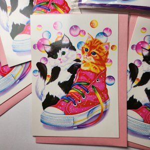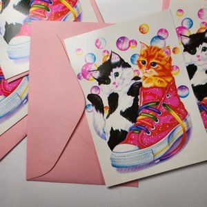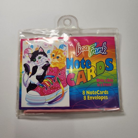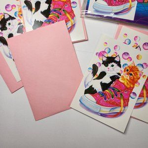 ⚡ Vintage Lisa Frank playful kittens in shoe note cards with envelopes stationery. Vintage 90's 1990 Lisa Frank playful kittens in sparkly pink high top shoe note cards with pink envelopes. Black and white cat with orange tabby. Thick plastic casing. Flaws: MISSING ONE. Comes with advertised seven cards and seven envelopes, and additional ephemera about joining the Lisa Frank club. ⚡