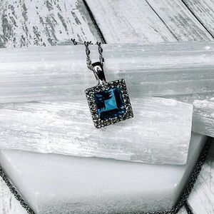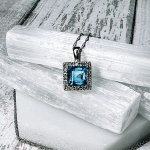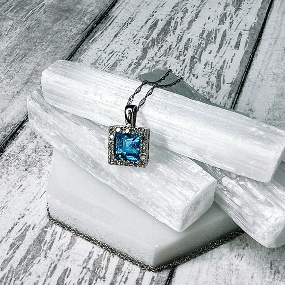 14k White Gold Princess Cut Blue Topaz & Diamond Necklace. The chain is 16 inches long. Photos were taken under a bright light, color may vary slightly. Open to offers, no lowballing please.