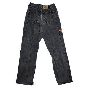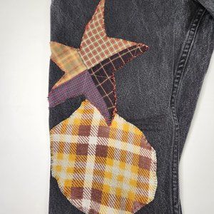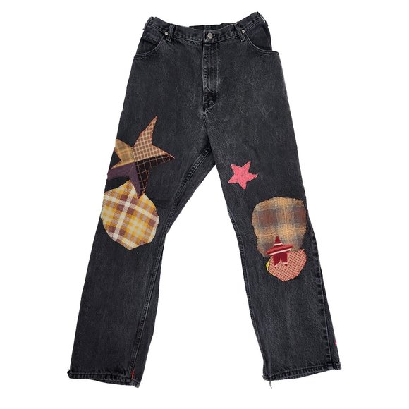 ⚡ 00's Wrangler patchwork jeans. Black reworked Wrangler jeans customized with plaid fabric scraps on the knees, handsewn on. Cut bottom hems. 90's grunge rockstar vibes. Baggy straight leg fit / boyfriend fit. High rise. Used to be a 40 x 32 pair, but were tailored down. Measures for a 28" waist or 28 x 30. Please read full measurements below. ⚡