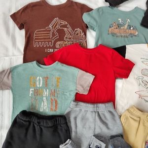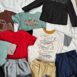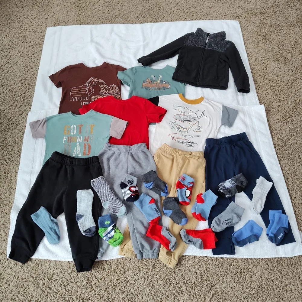 Included in this bundle are 5 T-shirts, mostly 3T but there are a couple 2T that fit more like 3T. 3 sweat pants and 1 pair lighter/ thinner pants than sweats, 1 Sherpa jacket size 3T and 17 pairs of socks. All lightly used but in good shape. All from a pet free, smoke free home. 27 items total, included in this bundle. ☺️