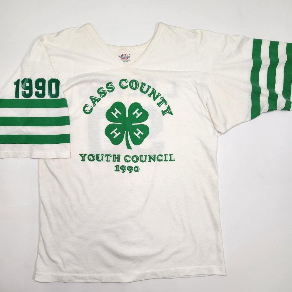 ⚡ Vintage 90's 4-H club single stitch jersey tee. Vintage local Cass County 4-H club youth council front and back graphic jersey style tee shirt. Dated 1990. FLAWS: yellow staining under arms and around neck, a few dot stains on front under graphic. Tagged unisex large. ⚡