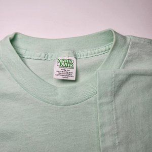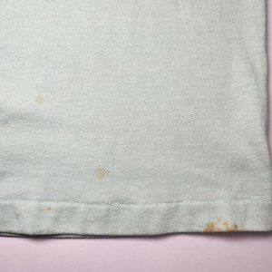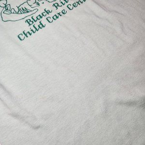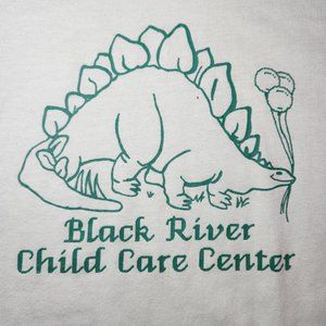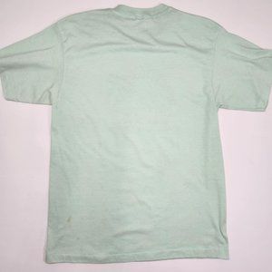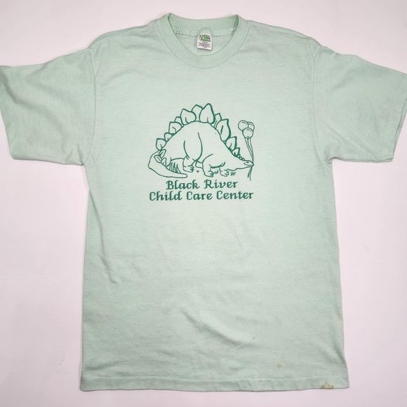 ⚡ Vintage dino graphic single stitch tee shirt. 80's Black River Falls, Wisconsin child care center single stitch tee with a graphic of a stegosaurus holding balloons. Mint green color. FLAWS: has some wash wear, stains on front near bottom hem. Tagged men's large, fits tight, measures like a modern small. ⚡