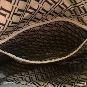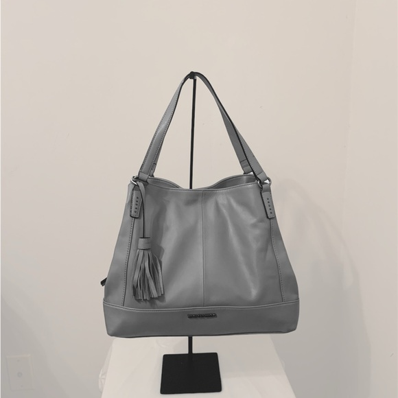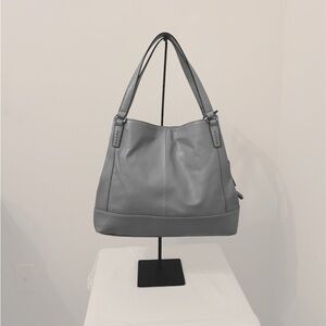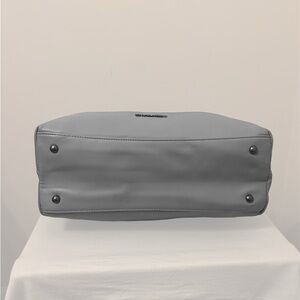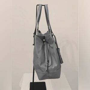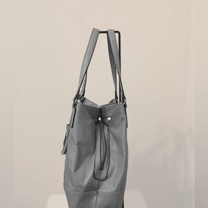 A large gray tote with three separate compartments, overall snap closure with a middle zip closure compartment.