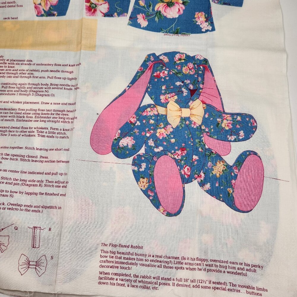 ⚡ Vintage cut and sew bunny rabbit fabric. 90's VIP cut and sew flop eared rabbit DIY pattern fabric. Make your own stuffed plush bunny with tiny pink flowers over a blue base. Floral cottagecore stuffed animal sewing project. Picture of additional materials required in photos. ⚡