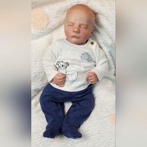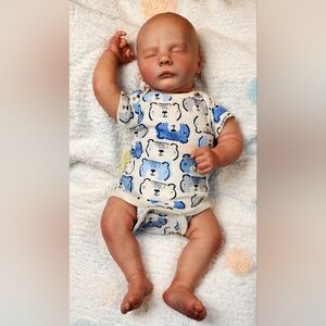 He weighs about 5 pounds and is 18 inches long. He has full vinyl arms and legs with a weighted cloth body. The weight tends to shift around in these dolls, so expect that.