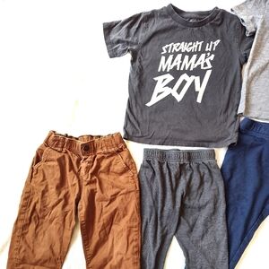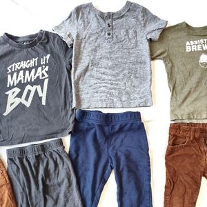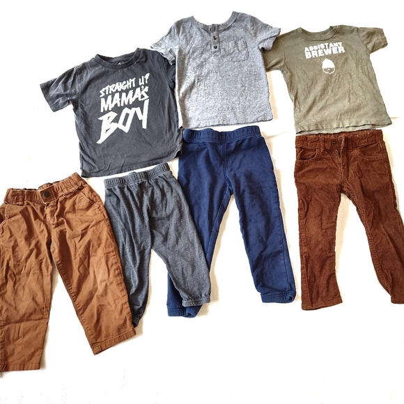 Included in this listing are 3 short sleeve T-shirts (Cat & Jack and a couple unknown brands). All shirts are size 3T... and 4 pairs of pants. Two of the pairs of pants are 3T (H&M brand, brown pairs), one pair of pants is 4T (dark blue Carter's brand) and one pair says 24M (dark gray pair Garanimals brand) but fits like a 3T. 7 items total included. All lightly used.