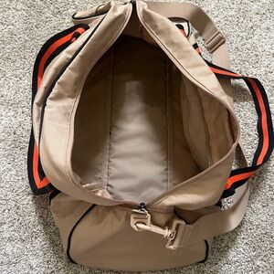 Good condition, small water stain on the bottom as shown in picture. Has an adjustable shoulder strap and many side pockets!