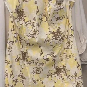 Women’s petite spaghetti strap dress. 12p. Lined. Hidden zipper. Yellow white tan/taupe. Open back. Slight stretch. 34” shoulder to hem. 24” armpit to hem. Cotton blend. Kept in storage bag. Halter top