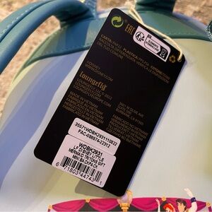 The Loungefly Little Mermaid Triton’s Gift Mini Backpack is made of vegan leather (polyurethane). Bag has adjustable shoulder straps and shiny gold hardware. Additional features include applique, foil, and printed details. Take note of the coordinating inside lining.