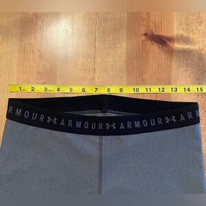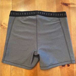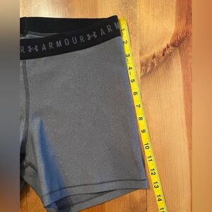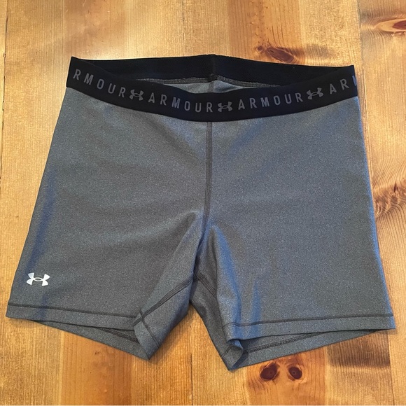 Dark Gray Under Armour Spandex Shorts. Estimated size M (no tag, see photos for measurements). Excellent pre-owned condition: absolutely no signs of wear, elastic in like new condition! Elastic waistband features classic under armour name and logo. White logo on front.