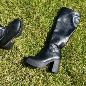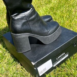 La Moda knee high boots size 8. They are a bit tight for my big calves. SUPER COMFY! Come with a box trying to find them a new home. Offers are welcome!