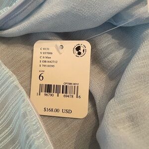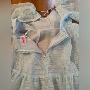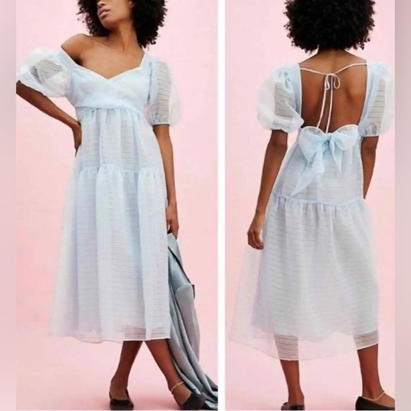 Absolutely stunning blue organza Hailey dress by Free People. Size 6, see photos for measurements! NWT, absolutely no signs of wear. Free people logo on tag has been marked through to prevent returns. Organza fabric adorns this sheer dress with many beautiful details and adjustable ties. Open back adds to the romantic feel. Bow can be tied in front or back (both shown in photos)! Would be stunning for an engagement shoot, maternity shoot, or any fun occasion!