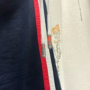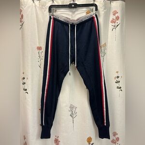 These are no longer sold in store or online! Super cute logo exposed elastic double waistband. Navy blue with red and white detailing!