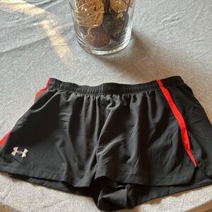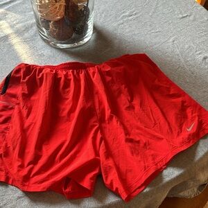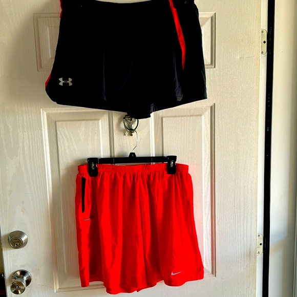 2 pairs sold together of running shorts the bright red pair has the mesh cut out due to when ever I ran or biked the band was way to tight on thighs very comfortable after that. Both pairs come from a smoke free environment and are in Excellent condition. Just time to move them down the road. Shoot me an offer always open for those .🤩🏴🇬🇧 Both have plenty of pocket compartments on side and back of shorts see pics