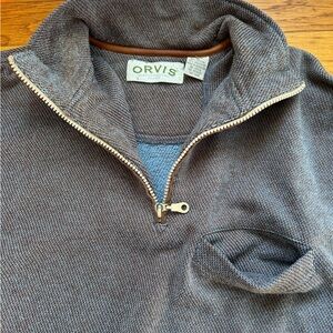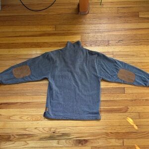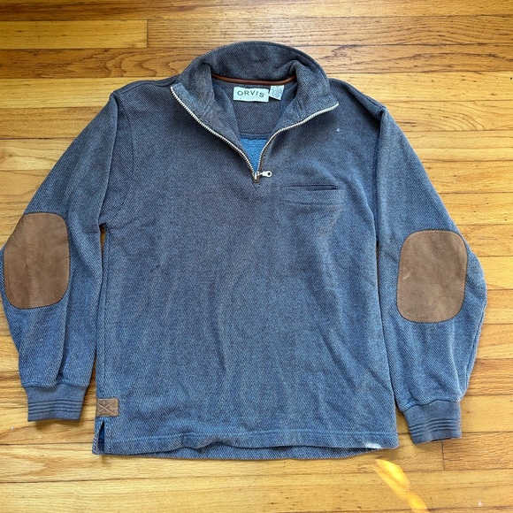 Orvis quarter zip. Has front pocket. Leather elbow patches, plus leather reinforcements on the sides at the bottom hem. Says large on the tag, but fits more like a big small/ medium.