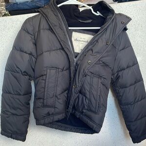 kids boys medium size, charcoal color. Puffy with fleece inside with hoodie. Comes from pet n smoke free home. Used in excellent condition.
