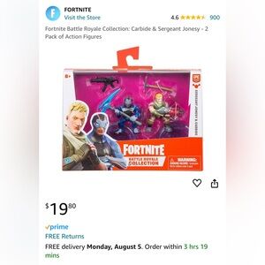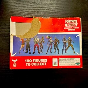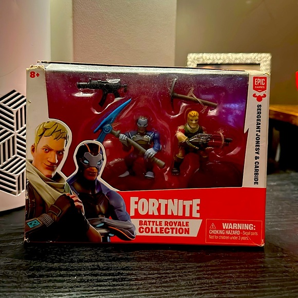 Brand new never opened Fortnite action figures. Please look at the pictures, box did get torn from my toddler. In the box are action figures Sergeant Jonesy and Carbide, 4 accessories and 2 bases for them. They have never been out of the box.