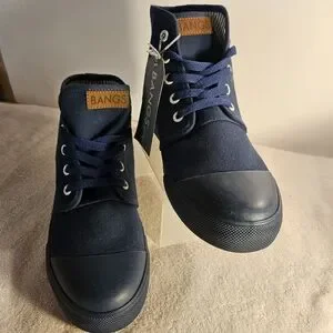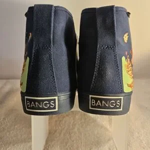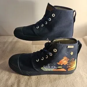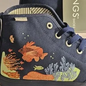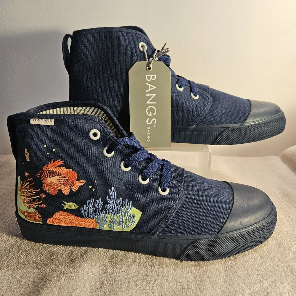 Step into the ocean with these navy blue BANGS Shoes. This discontinued "Under the Sea" design features a tropical sealife pattern with embroidered and painted accents on a canvas upper material. The high top shoe shaft style provides a comfortable fit with a lace-up closure and vegan-friendly features. These athletic sneakers are perfect for fashion and skateboarding, with a performance activity suitable for both men and women. The Ridge Parkway model is a canvas high top style, with a standard shoe width.