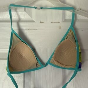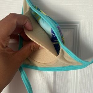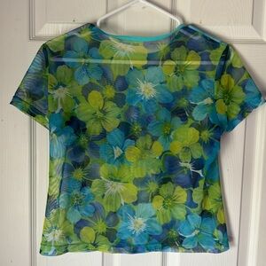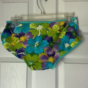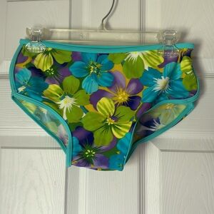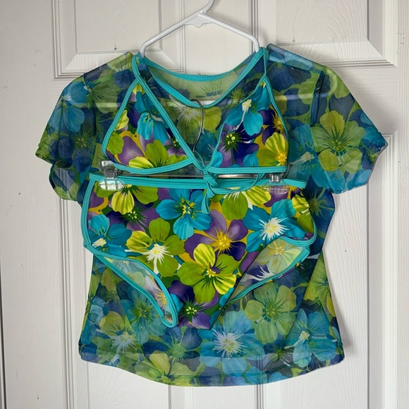 Vintage Floral Bikini set featuring beautiful turquoise, lime green and purple flowers and a mesh cover up t shirt style top. Bikini top is lightly padded (padding is not removable). Bottoms are boy short style. Open to offers. Size 10 but I’m a size 6 and it fits me perfectly. Just not my style. Measurements for cover up top: 16 inches across at shoulder, 20.75 inches long. bottoms: 13.5 inches across, 9 inches long. kinda hard to measure the bikini top but let me know what measurements you’d like specifically, if any.