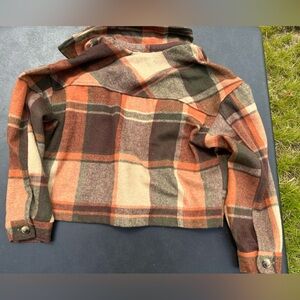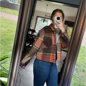 Beautiful cropped flannel jacket! Nice thick material and a pretty burnt orange color. Has only been worn a few times and is in great condition! Says a size large but it fits like a small. Would be super cute for the fall! Feel free to ask question and make offers!