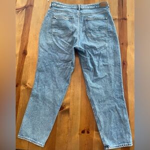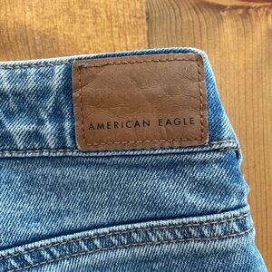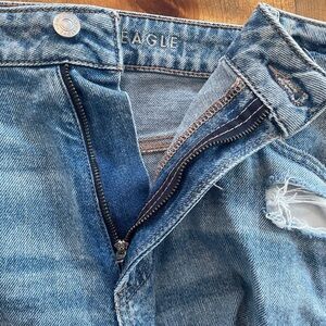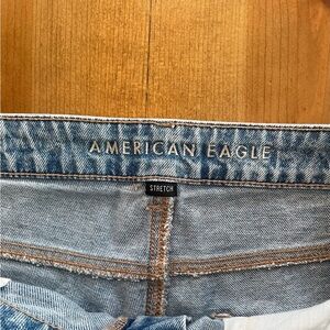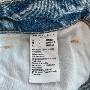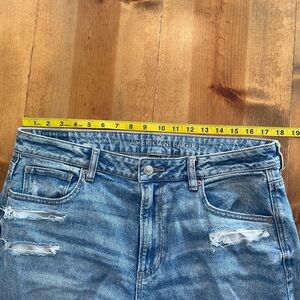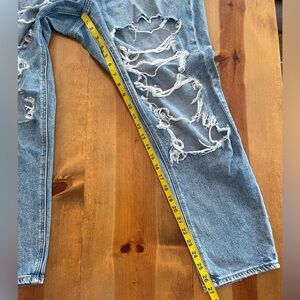 Ultra distressed Jeans by American Eagle. Women’s size 14, see photos for measurements! Great pre owned condition other than intended distressed detailing. Be advised there is a section of the right leg where fibers are not attached to other side of hole (see final photo). Features zipper and button fly. Stretch denim material makes for a comfortable fit!