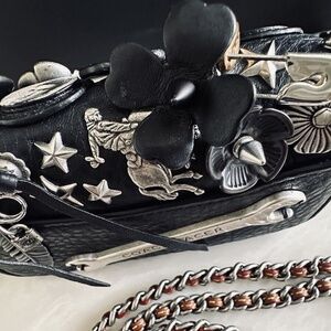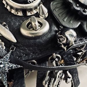 Talk about embellishments - wow this bag has just about every kind of pin, charm bead, fringe in black and green, tea roses, skulls, leather flowers, Rexy's, horseshoes, feathers, rocket, studs, rivets, pearls, pins, bullets, heart rivets, horse and rider, safety pins, locks, blue tiny crystal star dangling charm, Lost and Lucky script dangling charms, beer and soda caps and let's not forget the 3 Elvis photos and more - An amazing bag! Surely makes a statement - so fun and cool!