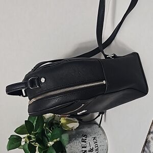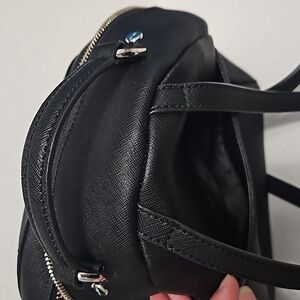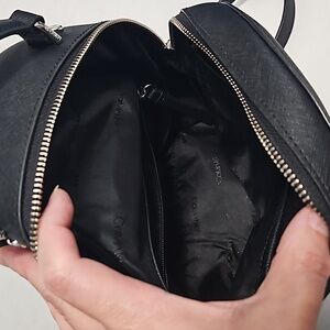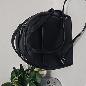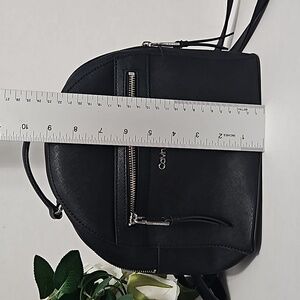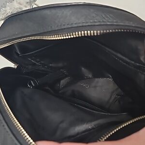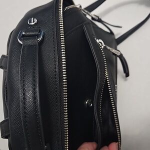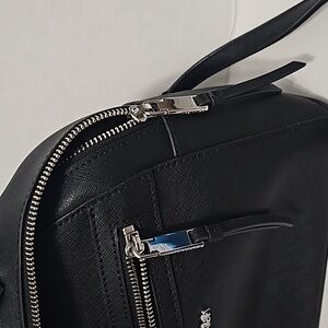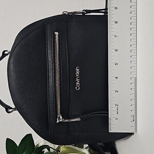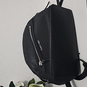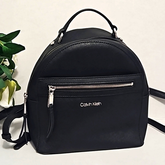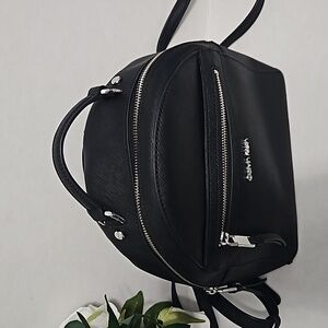 Like New Calvin Klein backpack. This is a beautiful small and convenient backpack. It has slip pockets in front and back and a front zippered compartment. The black and silver color accent any style and any outfit. Straps are adjustable to fit you comfortably.