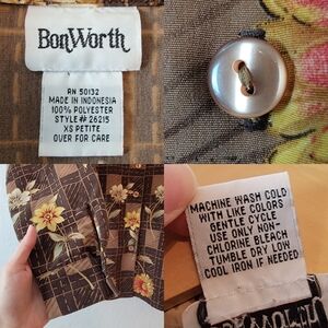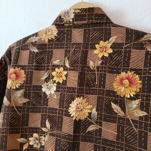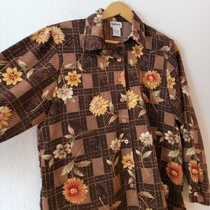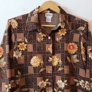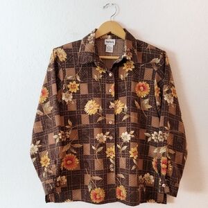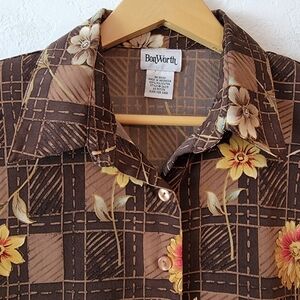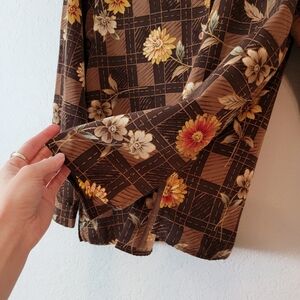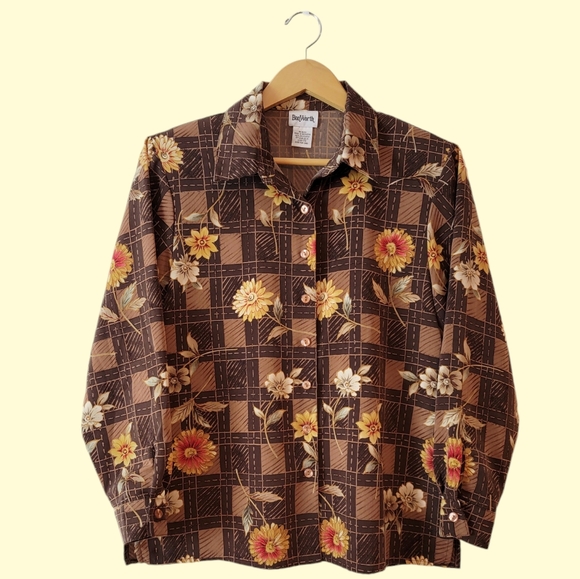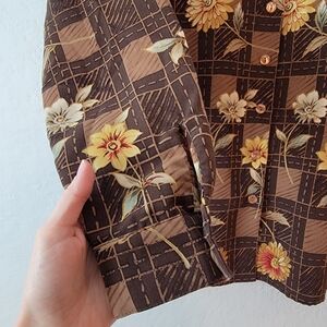 Details: The perfect brown checkerboard floral 90s whimsical southern gothic button down long sleeve shirt by BonWorth! Silky, lightweight material in near perfect condition!! Small shoulder pads that could easily be cut out. Whimsigoth 90s does 70s grunge meets southern romantic goth dark western cottage core kinda vibe!