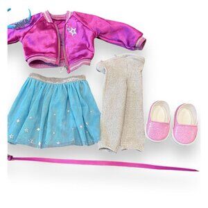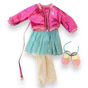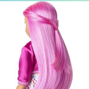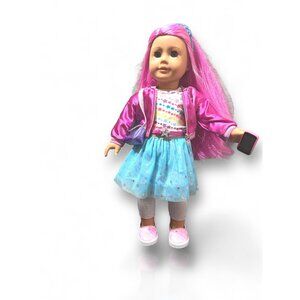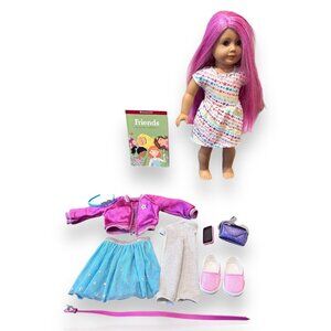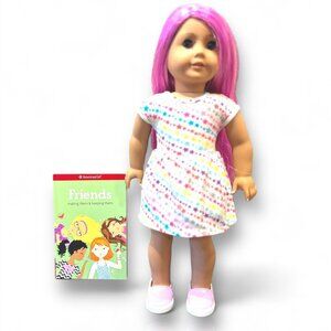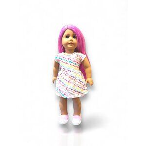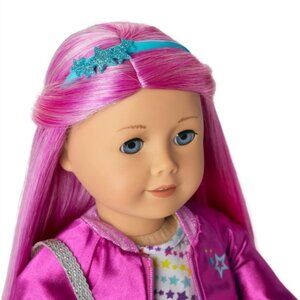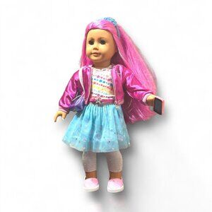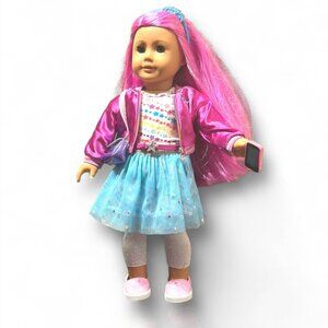 This 18-inch American Girl Truly Me™ Doll #87 doll features vibrant magenta hair and light blue eyes. She comes with a multicolored star skirt, pink shoes, and a variety of accessories for endless play possibilities.