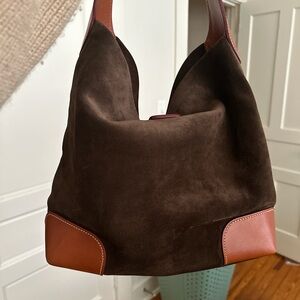 Vachetta trim bumpers help keep this bag upright even when empty