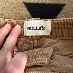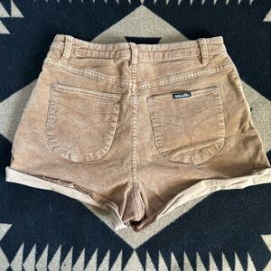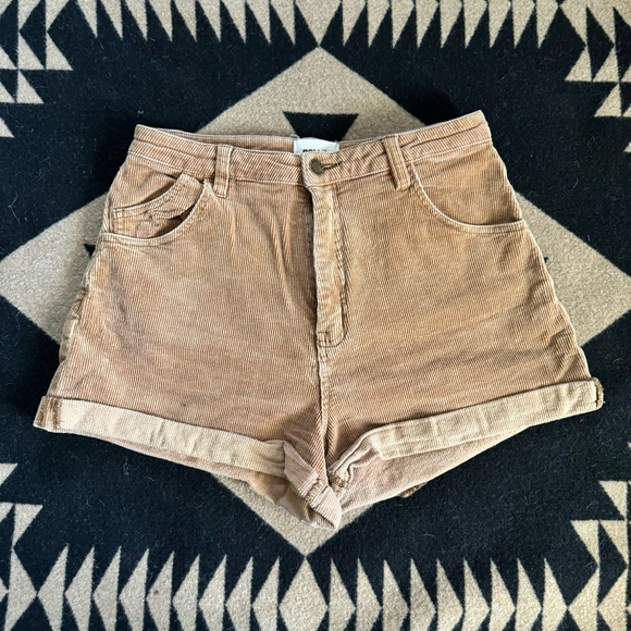 size 28. Cuff came undone in the back but can be fixed easily. Tan corduroy high-waisted shorts with rolled cuff