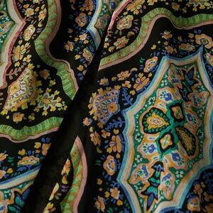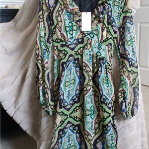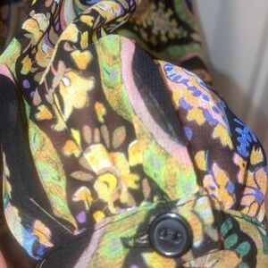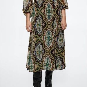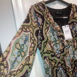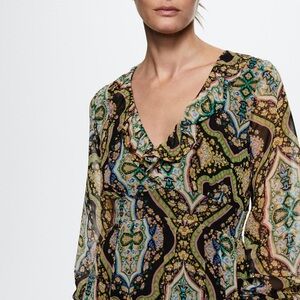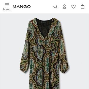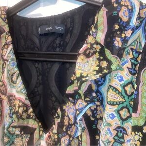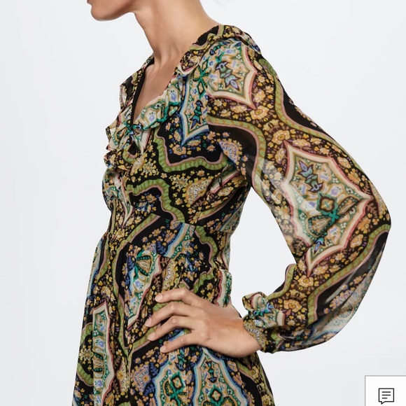 “Baroque” floral print dress from Mango. Feminine, soft, flowy fabric. Lined. V-neck with ruffle. Long sleeve with button closure at cuff.