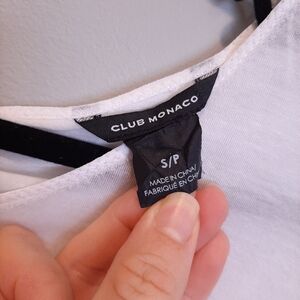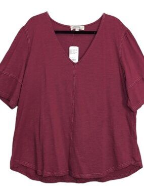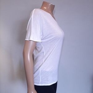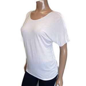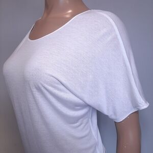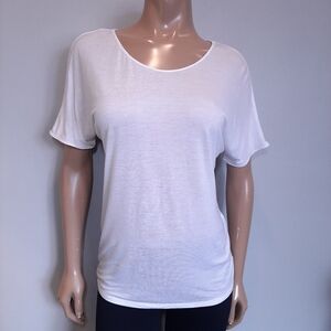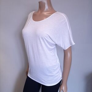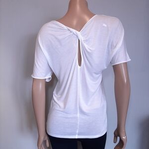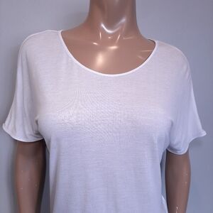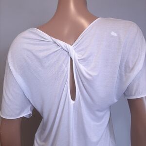 Features: Round neckline, short dolman sleeves, subtle frayed trim detail, semi-sheer material, twisted keyhole back, centered back seam, stretchy