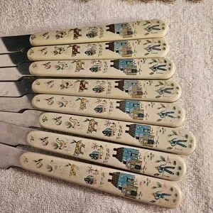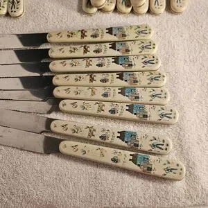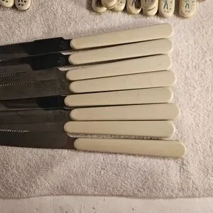 8 dinner knives made in Taiwan and 9 1/8 inches long.