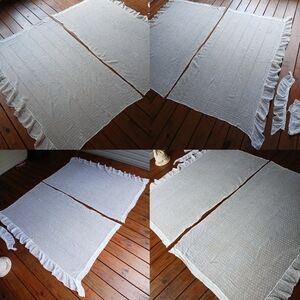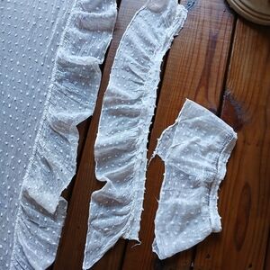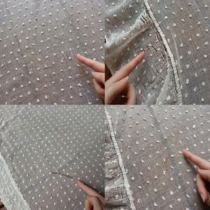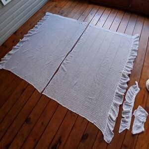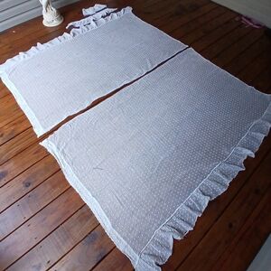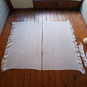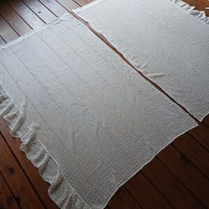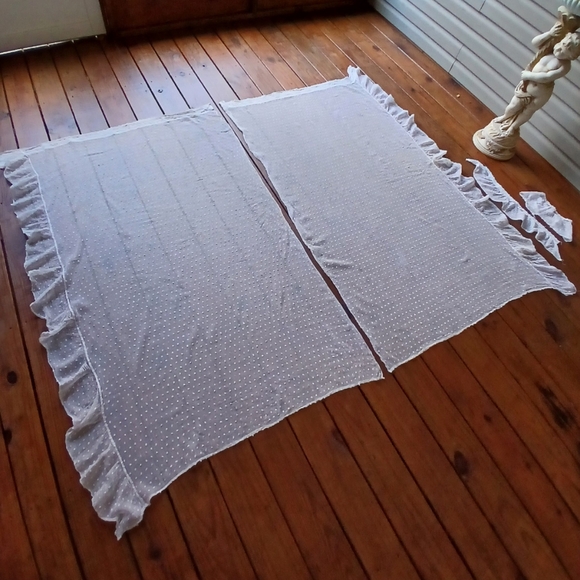 True antique vintage 1930's 30's white texture polka-dot lace curtains 41 × 64. So cute!! It has ruffle edges. These are almost the same as the others I just posted but doesn't have ruffles along the bottom. It's a gauzy kind of fabric used. I also found 2 small pieces maybe to tie them open? I spent so much time soaking, rinsing, hanging to dry and steam ironing. Ready to hang! These are in fairly nice condition. There is some seam stress on edges, stress in lace, a few holes around and a few faint small stains.. Will probably need some small repairs. Overall wonderful for it's age and will wear well either way honestly. Happy to answer any questions ♡♡
