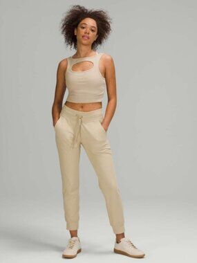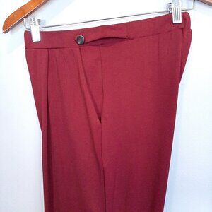 Excellent condition, polyester & spandex blend. Elasticized waistband, silver tone button accent, front slash pockets and ruched ankle. Very stretchy for a comfortable fit.