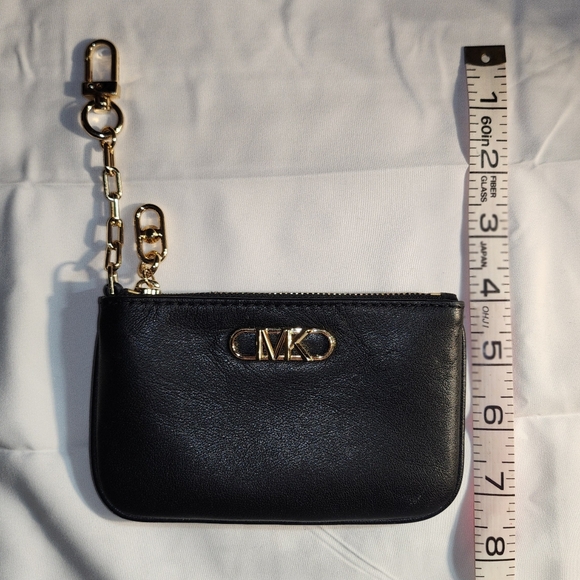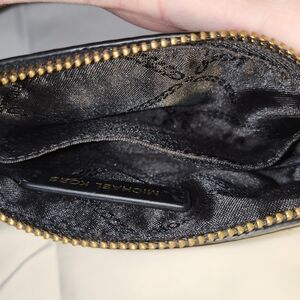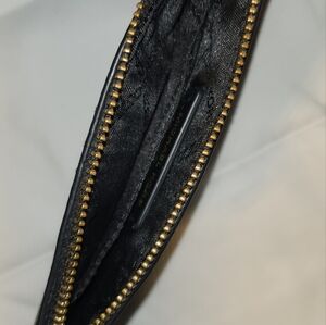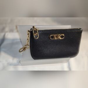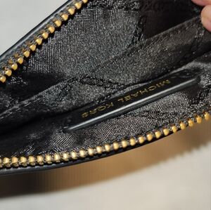 This black Michael Kors Wallet features gold hardware and an back slip pocket, along with two inside compartments.