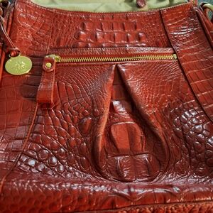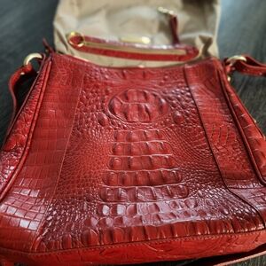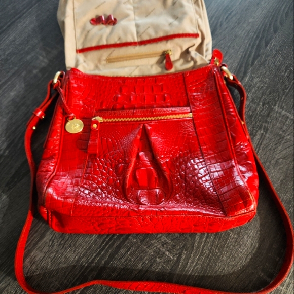 This is a rich, beautiful red leather Katie crossbody style Brahmin Purse. In excellent condition & no marks or scratches. The lining is clean and has two zipper pockets 1 small & 1 lg, 2 slip pockets, key clip and 2 pen loops inside and a zipper pocket & slip pocket on the outside front. All gold hardware.