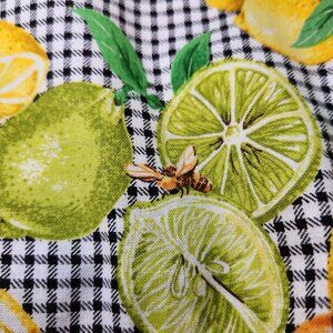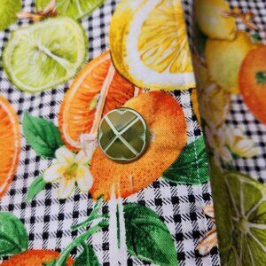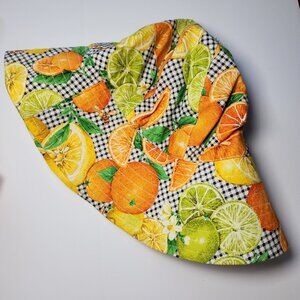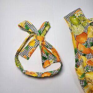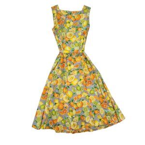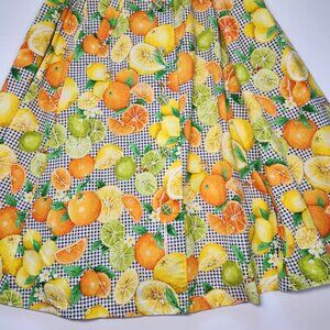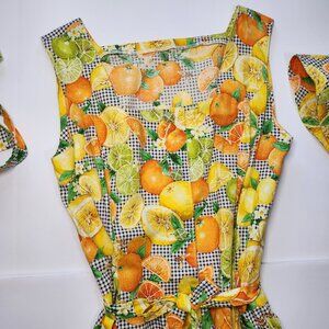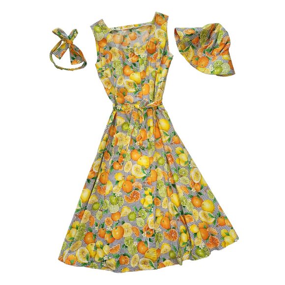 ⚡ Retro 1950's style citrus and bees sleeveless a-line dress. Perfect gingham picnic dress with a bold print of Florida oranges, lemons, and limes with little bees buzzing about. Adorable lime buttons. Square neckline. About midi length, depending on your height. Homemade with 100% cotton fabric. Comes with accessories: a belt, head tie, and bucket hat. Approximately a women's size medium or dress size 6-8, please read measurements below. ⚡