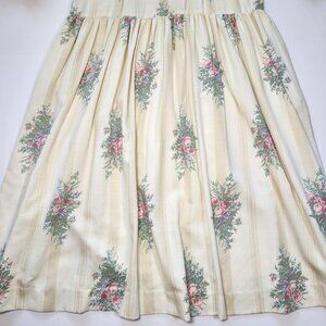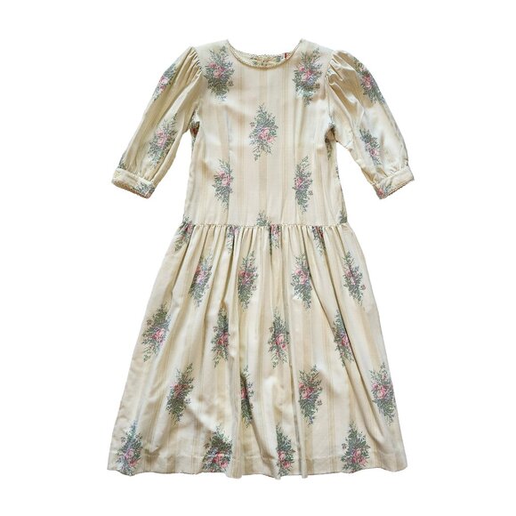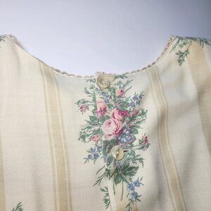 ⚡ Vintage 70's garden dress. Grandma or 90's babydoll grunge punk pale yellow with cream striped quarter sleeve dress. Features puff sleeves, shoulder pads, a big floral print with foliage, and buttons up the back. Drop waist. Probably hits below knee length on most. Tagged vintage women's size 10 or large, please read measurements. ⚡