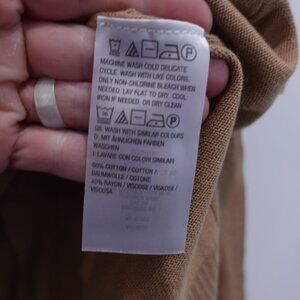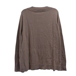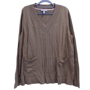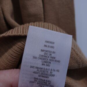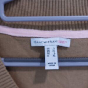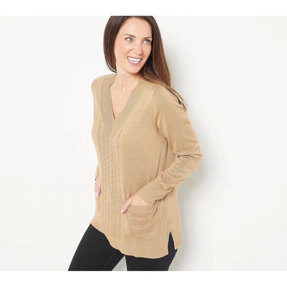 Tags: Isaac Mizrahi Live, camel sweater, pullover knit, V-neck sweater, novelty trim, cozy knit, fall fashion, neutral tones, wardrobe essential, women’s size L, chic layering, elevated basics, soft knit, medium weight sweater, knitwear
