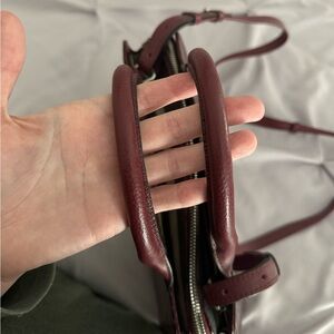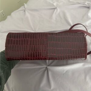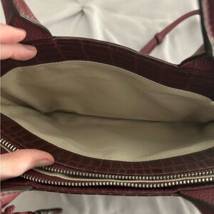 This is a rich burgundy croc-embossed leather top handle handbag from Radley London, with a detachable and adjustable crossbody strap. Can be worn hand-held, crossbody, or as a shoulder bag, so extremely versatile. A timeless design, this bag is in excellent condition and perfect for the fall/winter seasons.