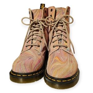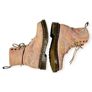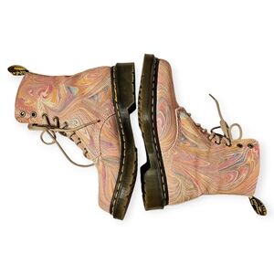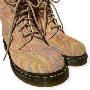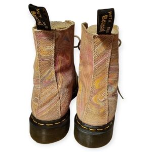 The marbled effect has been used for centuries and was fully embraced in the hazy 70s. Our 1460 boot takes this technique for a wild trip with summer-friendly Marbled Suede. The 8-eye 1460 is fitted with antique gold eyelets and tonal laces. Grounded on a classic smoke AirWair sole punched with our yellow welt stitch. Signed off with a functional heel loop.