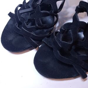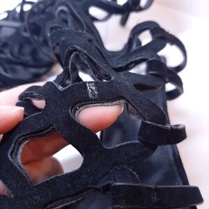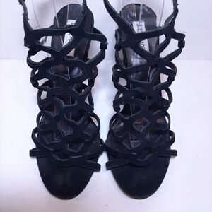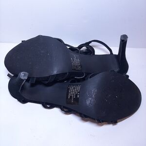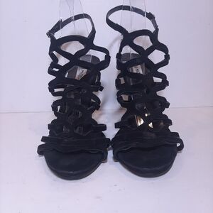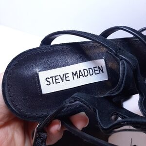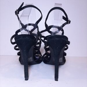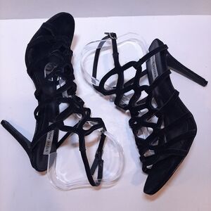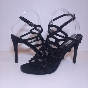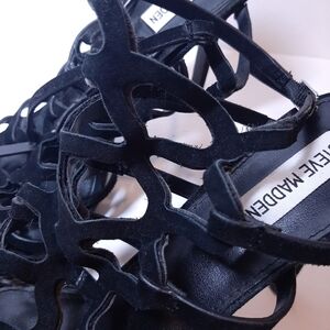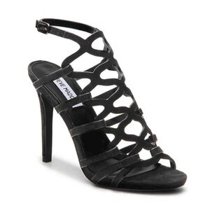 Elevate your style with these stunning Steve Madden Freyda suede stiletto heels. The caged black leather strappy design with an open toe and adjustable ankle strap provides a bold and stylish look. The ultra high heel height is perfect for formal occasions such as weddings or parties.