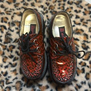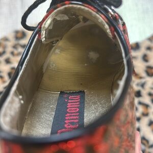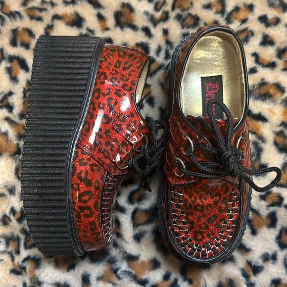 Gently used, little wear outside but some wear off the good insoles. Super cute red and black cheetah/leopard print goth punk platforms. I just never wear them anymore red they need a good home! Size 6 in women’s true to size.