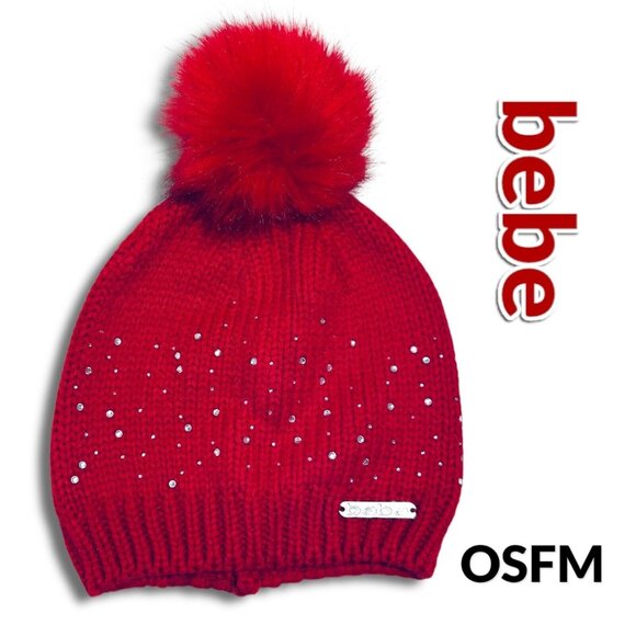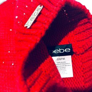 Bebe Womens Red Knit Pom Pom Beanie Hat w/Decorative Snowfall Rhinestones. NWOT!