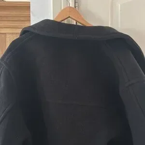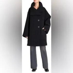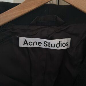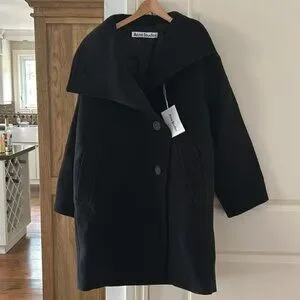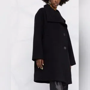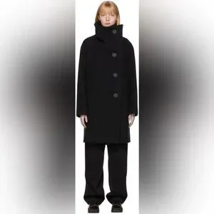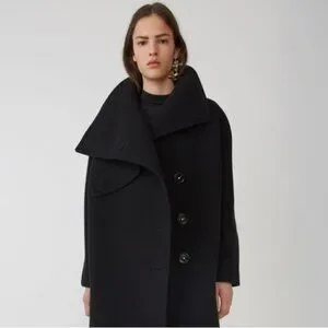 Acne Studios black coat is crafted from voluminous wool and features a funnel-neck, off-centre button-up closure and is complete with side seam pockets. Cut to a relaxed silhouette with elongated sleeves and long length.