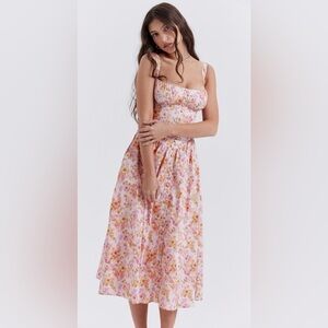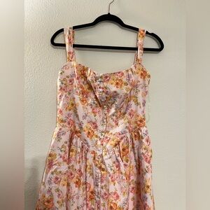 Size women's large with plus cup pink floral house of CB Tatiana dress. Midi length with corset back and side zipper. Also has adjustable straps.